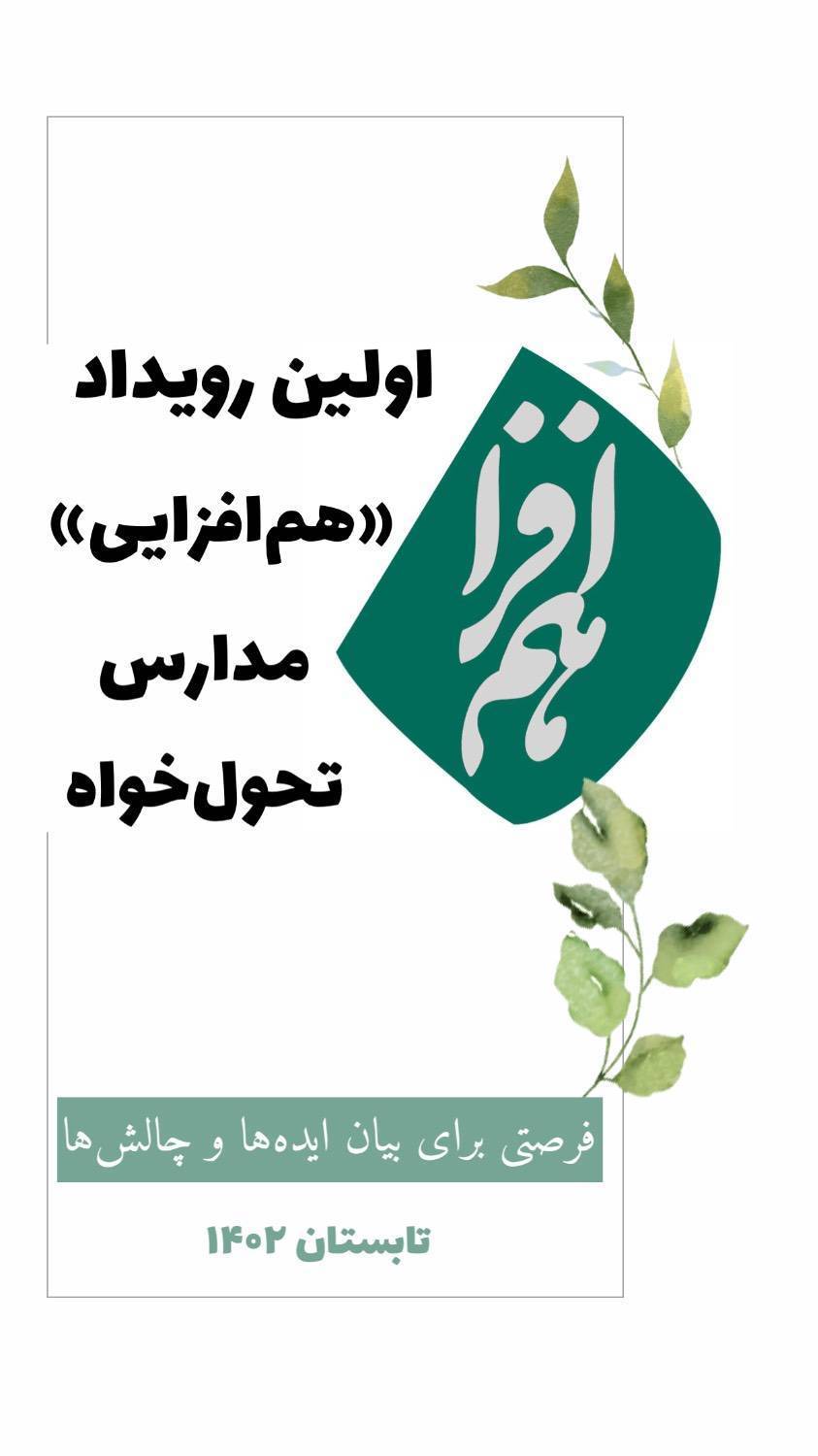 نخستین رویداد همافزایی مدارس تحولخواه برگزار شد.نخستین رویداد همافزایی مدارس تحولخواه با همکاری مجموعه شهید چمران و اندیشکده فرهنگ و تربیت اسلامی دانشگاه امام صادق(ع) طی سه روز، از ۱۳ تا ۱۵ تیرماه...